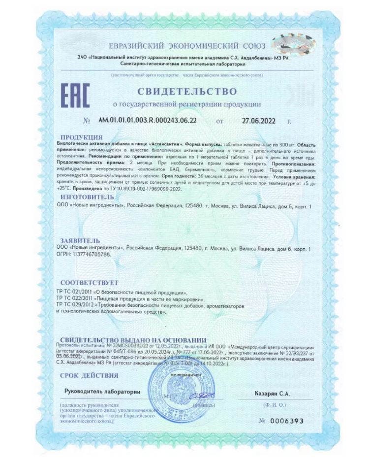 Поставляется в пластиковой банке с крышкой с контролем вскрытия. В упаковке 60 таблеток массой по 300 мг. Содержание астаксантина в суточной дозе – 6 мг.
