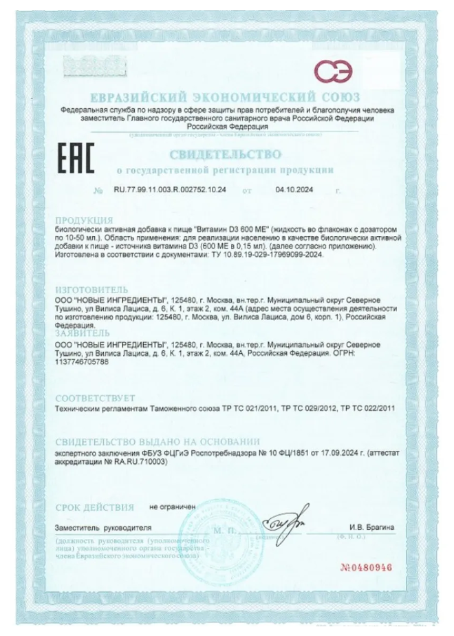 Пищевая добавка способствует правильному развитию скелета у детей, укреплению и минерализации костной ткани, включая зубы. Витамин Д3 улучшает усвоение кальция и фосфора, чем предотвращает развитие рахита и деформации скелета.